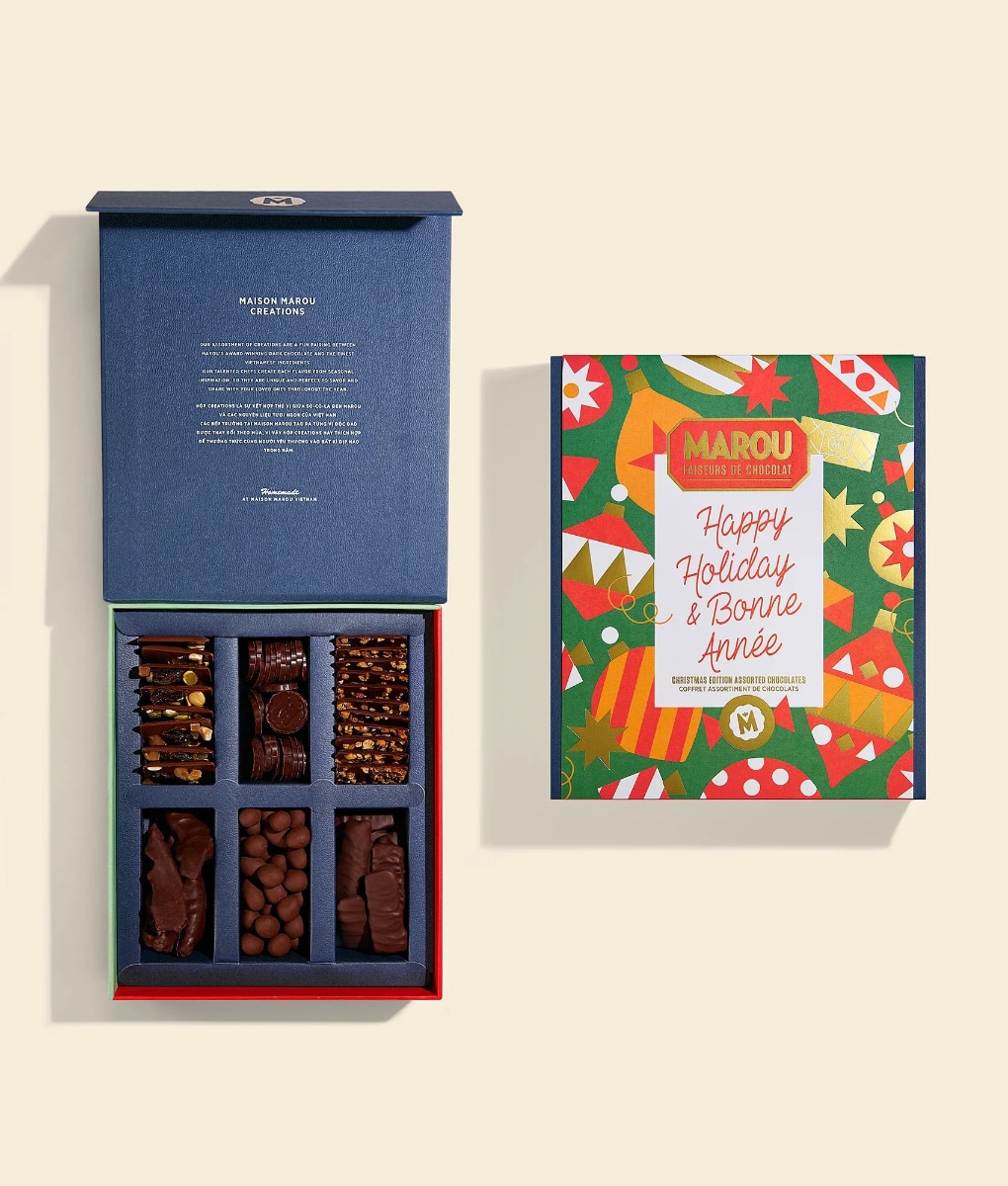De eerste feestelijke chocoladeassortimenten verschenen in de 19e eeuw als luxe geschenken voor het eindejaar. Marou blaast deze traditie nieuw leven in met een Vietnamese toets: tropische ingrediënten, lokale cacao en een ambachtelijke afwerking die elke hap bijzonder maakt.